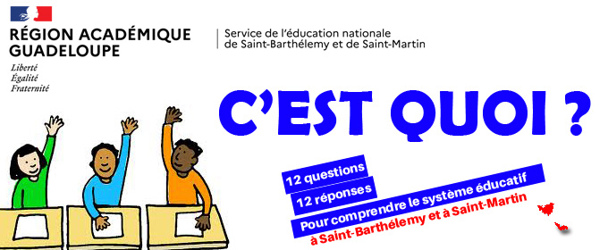 « C’est quoi ? » est une nouvelle rubrique du site du service de l’éducation nationale qui se propose de présenter le système éducatif à Saint-Barthélemy et à Saint-Martin. A partir d’articles publiés chaque semaine durant les trois premiers mois de l’année scolaire, vous découvrirez différentes facettes du monde de l’éducation nationale sur ces deux territoires ainsi que les spécificités propres à nos deux îles. Bonne lecture !